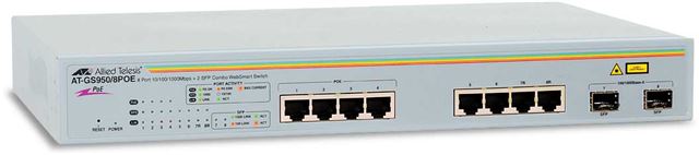 AT-GS950/8POE-50, 8-port 10/100/1000 Gigabit PoE Smart Switch including 2 Combo 1000BaseT/SFP, 4 port POE , Fanless design, 802.3ad Link Aggregation, Asymmetric VLAN, Auto Voice VLAN, MAC/IP filtering,web based management, rack