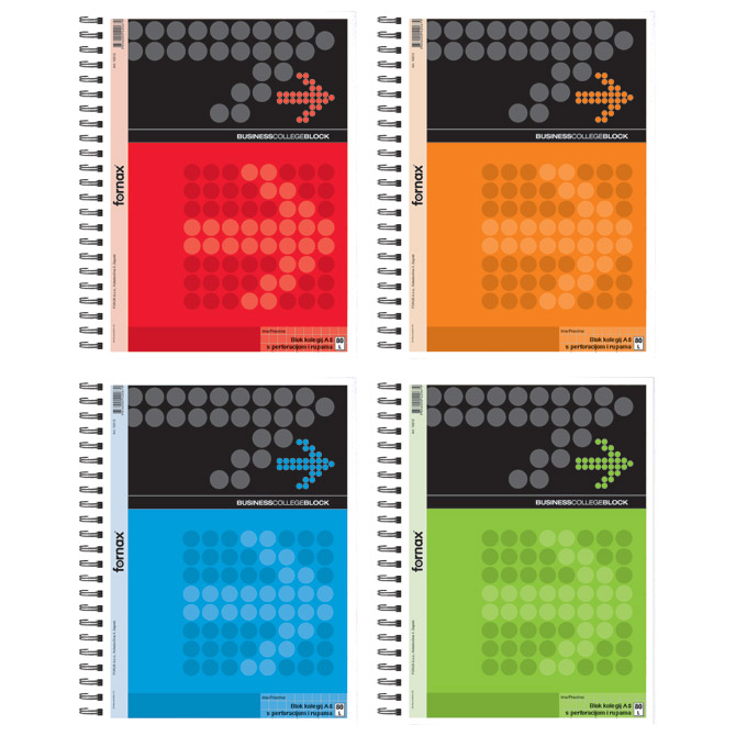 mekane korice; 70 listova; 70 g/m2; s rupama i perforacijom; boje korica: crvena, narančasta, plava i zelena; s designom Pakiranje: 4/64/3456 Boja: sortirano