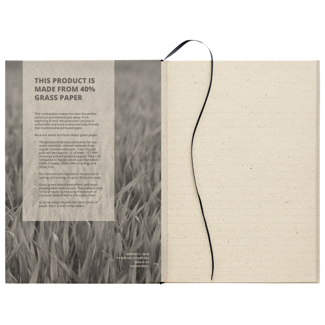2 bloka samoljepljiva natur (dimenzija: 72×100 mm, 70 listova + dimenzija: 50×72 mm, 25 listova) i 3 bloka zastavica natur (dimenzija: 20×50 mm, 26 listova); izrađeni od od recikliranog papira i trave; dimenzija: 8x10x2 cm; u kartonskoj korici