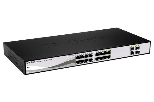 DGS-1210-16, 12 x 10/100/1000Mbps, 4 x Combo 1000BaseT/Mini-GBIC SFP ports, Advance power saving features, Fanless design, Asymmetric VLAN, Auto Voice VLAN, 802.1p priority queues, MAC/IP filtering, compact CLI