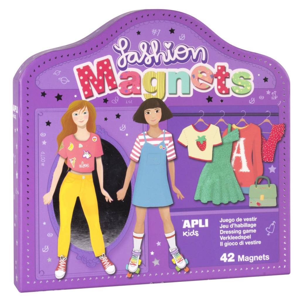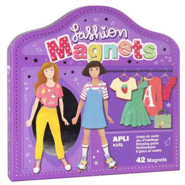 Sadržaj: magnetska sklopiva podloga dimenzija 28×20,5cm i 42 magneta s različitom odjećom prema najnovijoj modi.