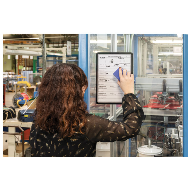 format: A4; piši-briši (koristi se marker za bijelu ploču); s magnetom (magnetno zatvaranje na 3 strane); lako se može premjestiti; za staklo i sve glatke površine; postavljanje: vodoravno ili okomito; za privremene bilješke direktno na etui (bez oštećenja dokumenta); bilješke se mogu pobrisati nakon nekoliko mjeseci; prednja folija: PET 290 mikrona; stražnja folija: PP 100 mikrona; set od 2 komada