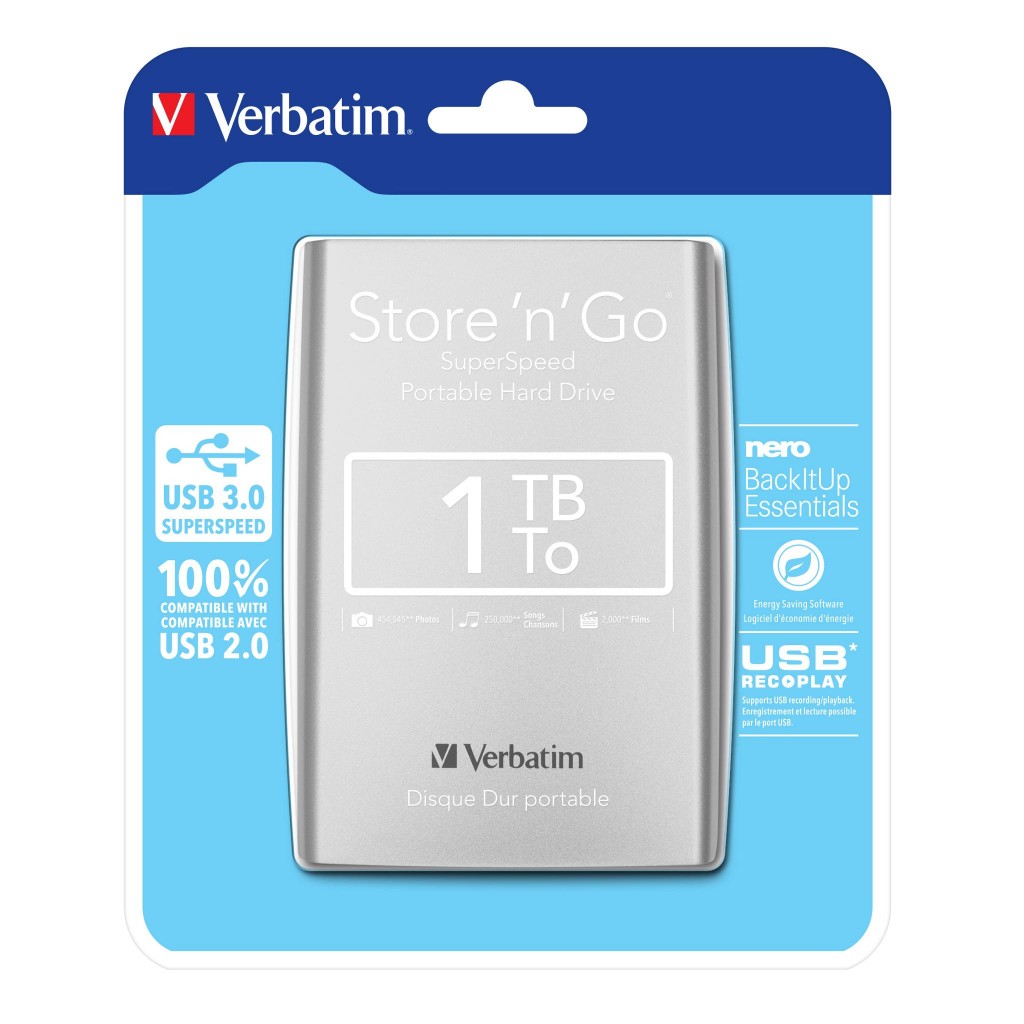 Opis: Prijenosni tvrdi disk Verbatim Store n Go ima pohranu visokih performansi pomoću USB 3.0 “Super Speed” sučelja. USB 3.0 nudi do 10 puta brži prijenos podataka od USB 2.0 (na temelju brzine USB sabirnice) pružajući ultra brzi prijenos podataka u pokretu.