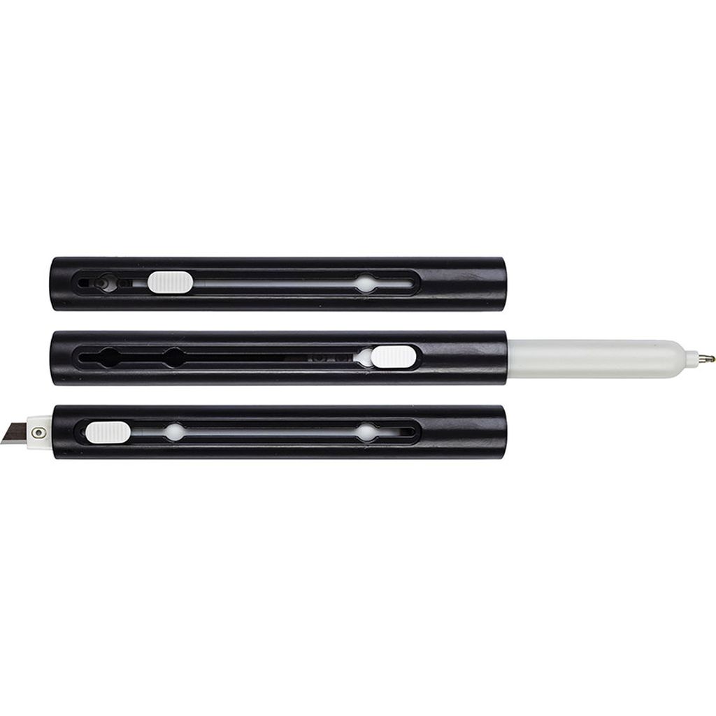 Opis: Kemijska olovka s integriranim rezačem za pakete kombinira funkcionalnost pisanja i praktičnog otvaranja ambalaže. Piše plavom tintom debljine 0,7 mm i ima ugrađeni mali skalpel za brzo i sigurno rezanje. Prikladna je za uredsku i skladišnu upotrebu.