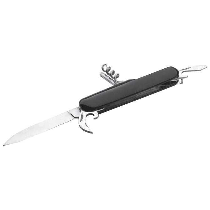 nehrđajući čelik; sadrži 7 alata: otvarač čepa za bocu, vadičep, odvijač, alkicu..; dimenzija: 9×2,5×1 cm Pakiranje: 1/25/200 Boja: crna
