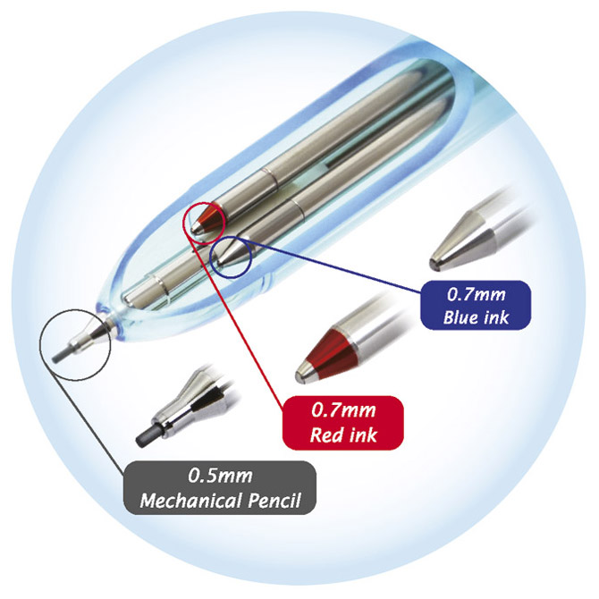 2 kemijske: 1 crvena i 1 plava tinta i tehnička olovka (mina 0,5 mm); 360° okretni mehanizam; rezervni uložak D1BR6707; u kartonskoj poklon kutiji