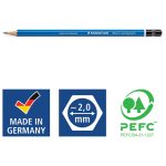 šiljena; šesterokutna; bez gumice; vrhunske kvalitete; mina je izrađena po posebnoj formuli koja joj kao rezultat daje metalik sjaj u širokom rasponu sivih tonova; za pisanje, crtanje, skiciranje i sjenčanje kao i za profesionalnu grafičku i umjetničku primjenu na papiru i mat foliji; izuzetno otporna na lom; izrađena od certificiranog drva