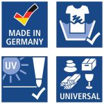 idealna za korisnike u industriji; primjena moguća na gotovo svim površinama (staklu, koži, tekstilu, kamenu, metalu, drvu i plastici); za mat markiranje i na tamnim površinama; ne prodire na drugu stranu papira; topiva u vodi; može se oprati sa mnogih glatkih površina i tekstila; ne blijedi; ne sadrži otapala; ne isušuje se; bez mirisa; pigmenti boje ne izazivaju koroziju; set od 12 komada