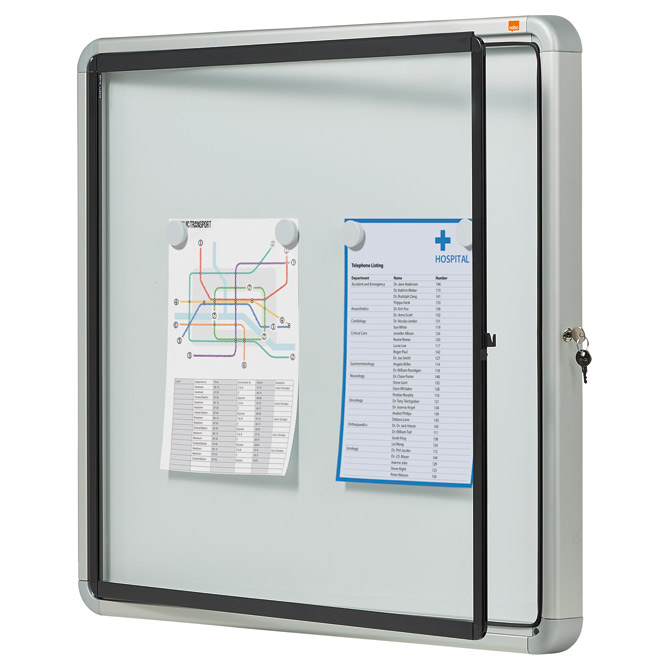 može se koristiti unutar i van zatvorenih prostora; vodootporna; aluminijski okvir; staklena krilna vrata (4 mm); set tipli i vijka za postavljanje na zid; držač za markere i brisač; mogućnost zaključavanja (2 ključa)