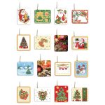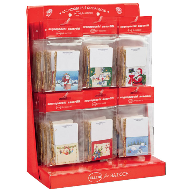 dimenzija: 5,5×4,5 cm; sa zlatnom vrpcom koja nije provučena kroz privjesnicu; offset i zlatni print na kartonu; 16 sortiranih motiva; set od 6 komada; u prozirnoj pvc vrećici; blister