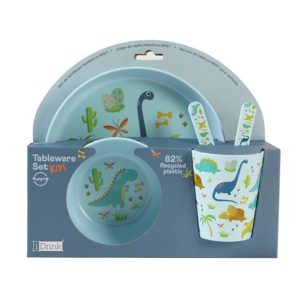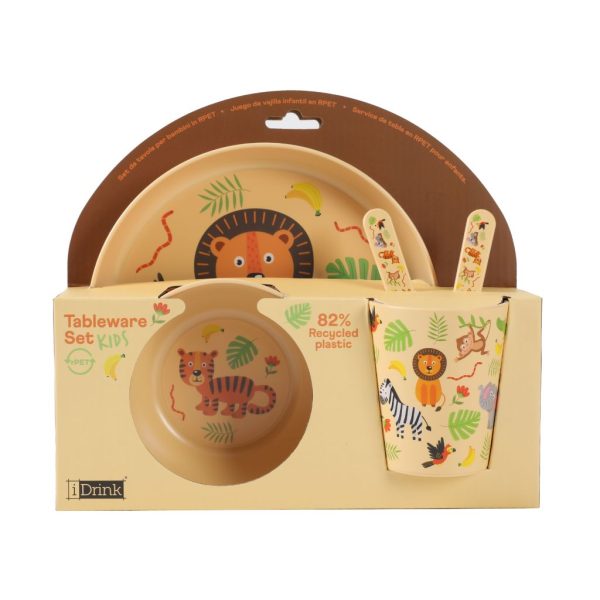 Set sadrži: tanjur, zdjelicu, čašu, te žlicu i vilicu.
