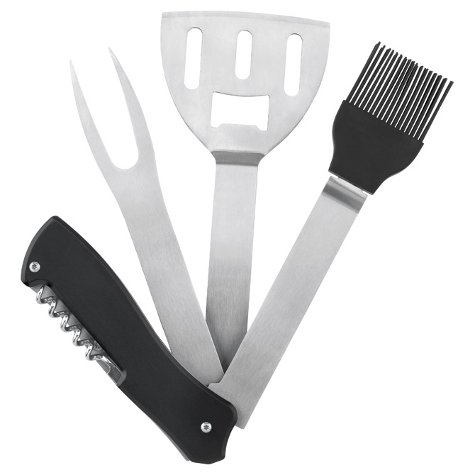 sadrži: 5 dijelova: otvarač za boce, vilica, lopatica i kist; nehrđajući čelik (dio kista je od plastike); dimenzija: 22×8,5 cm; težina: 750 g; u kartonskoj kutiji Pakiranje: 1/24 Boja: crna