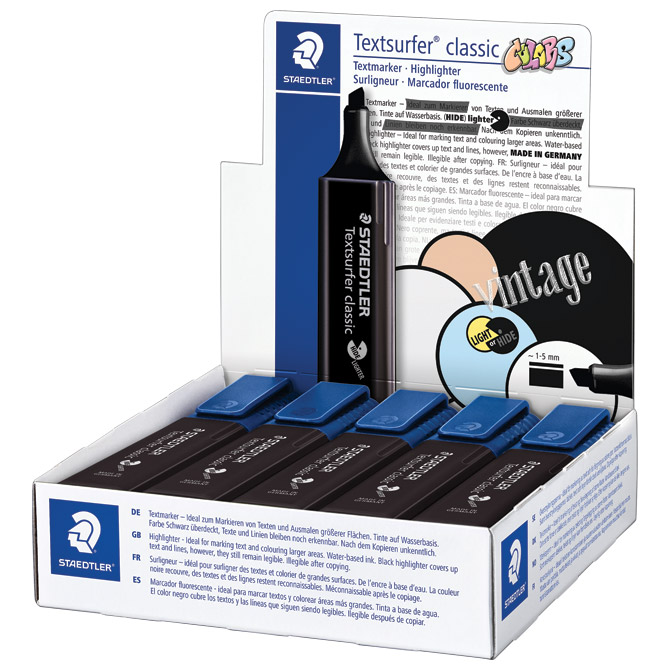 klinasti vrh; širina ispisa 1-5 mm; spremnik i poklopac PP; signir sa velikim spremnikom za tintu; tinta na bazi vode; za papir, faks i fotokopije; boje se ne razmazuju na ink jet ispisima; brzo se suši; ultra mekan; okretni poklopac za lako otvaranje; siguran rad u zrakoplovu zahvaljujući sustavu za izjednačavanje tlakova koji sprječava istjecanje tinte (airplane safe); crni signir prekriva tekst i retke, no oni i dalje ostaju čitljivi, ali su nakon kopiranja nečitljivi