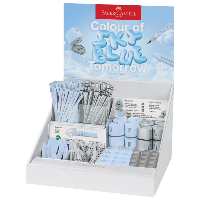 sadrži: 120 grafitnih olovaka Grip 2001 (60 x siva i 60 sky blue); 8 šiljila 3rupe Grip 2001 (4 x siva i 4 x sky blue); 24 šiljila mini Grip 2001 (12 x siva i 12 x sky blue); 30 gumica Grip2001 (15 x siva i 15 x sky blue)