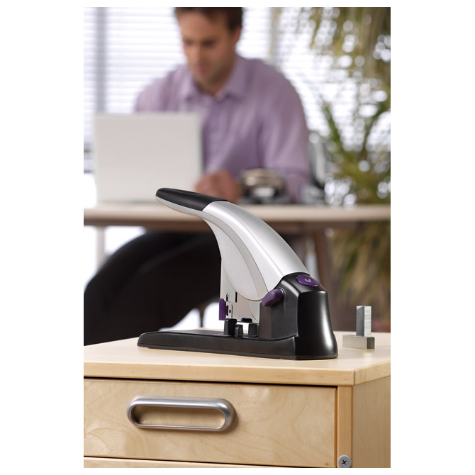 stolni; metalni; spaja do 12 mm debljine ili 120 listova papira 80 g/m2; dubina spajanja 56 mm; spajanje: zatvoreno klinasto; spajalice: Mercury 2500 (1 kutija sa 400 kom spajalica Mercury uključena); gumb za otpuštanje zaglavljenih spajalica; garancija 5 godina