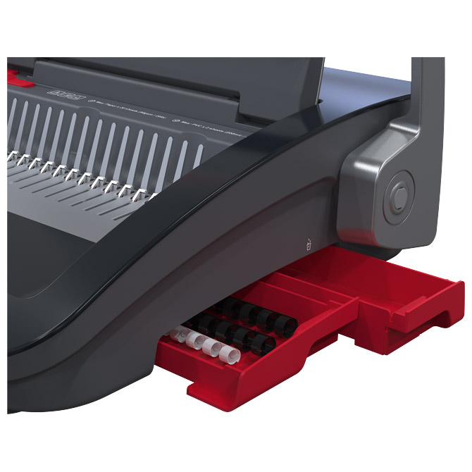 format: A4/A5; buši do 25 listova 80 gramskog papira; ručna bušilica s dvostrukom ručkom za glatko uvezivanje uz minimalan napor; kapacitet: 45/390 listova; može uvezivati do 390 listova formata A5/A4 (80 g/m2) odjednom koristeći plastične spirale promjera 45 mm; zahvaljujući svom laganom i prostorno učinkovitom dizajnu, može se koristiti bilo gdje i bilo kada te se lako posprema kada nije u upotrebi; uključuje ladicu za ostatke papira radi lakšeg odlaganja te praktičan pretinac za odlaganje pribora; dimenzije: 497x402x394; garancija na stroj 2 godine