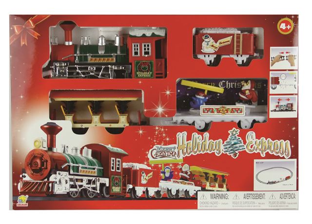 Vlak na baterije Holiday Express. Vlak se sastoji od lokomotive i 3 vagona u božićnom ruhu. Vlak ima božićne melodijei svjetlo. Potrebne 2 AA baterije koje nisu uključene. Vlak se kreće prema naprijed i prema nazad. Dob 3+.