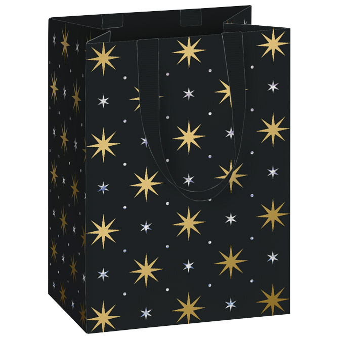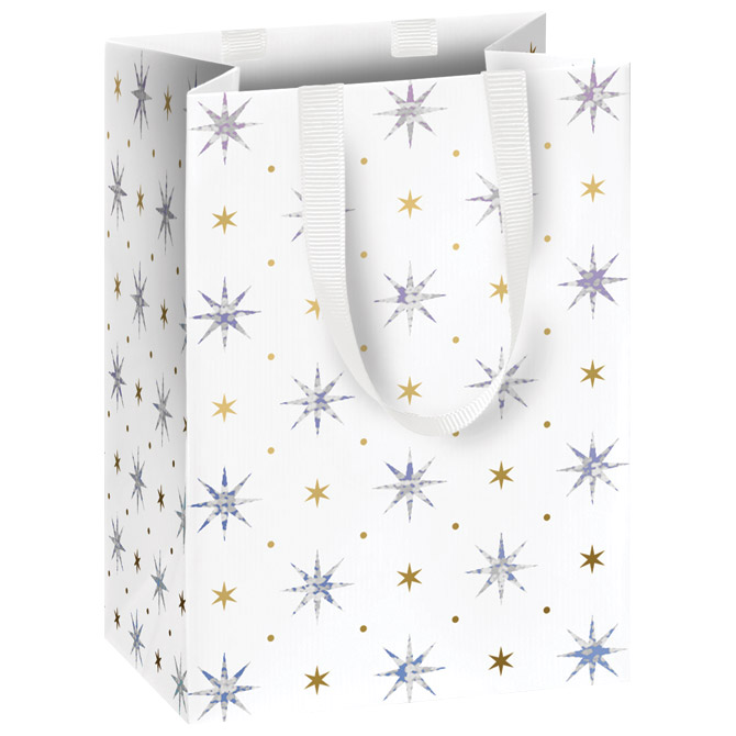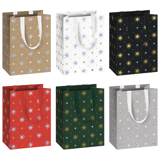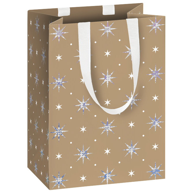 papir bijeli premazni; folija parcijalno; ručke: saten; dimenzija: 10x14x8 cm; motiv: 6 zvjezdice; blister Pakiranje: 1/48 Boja: